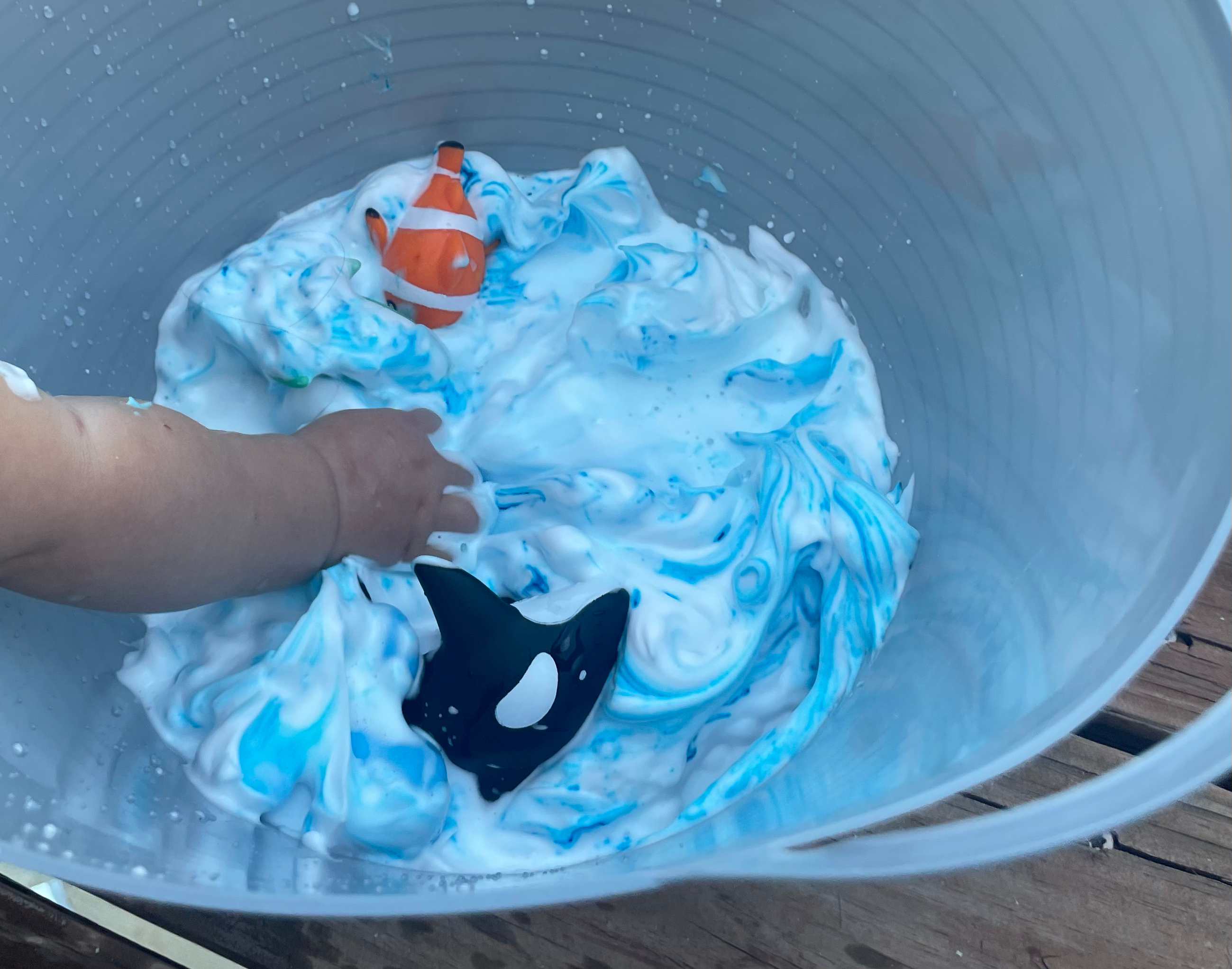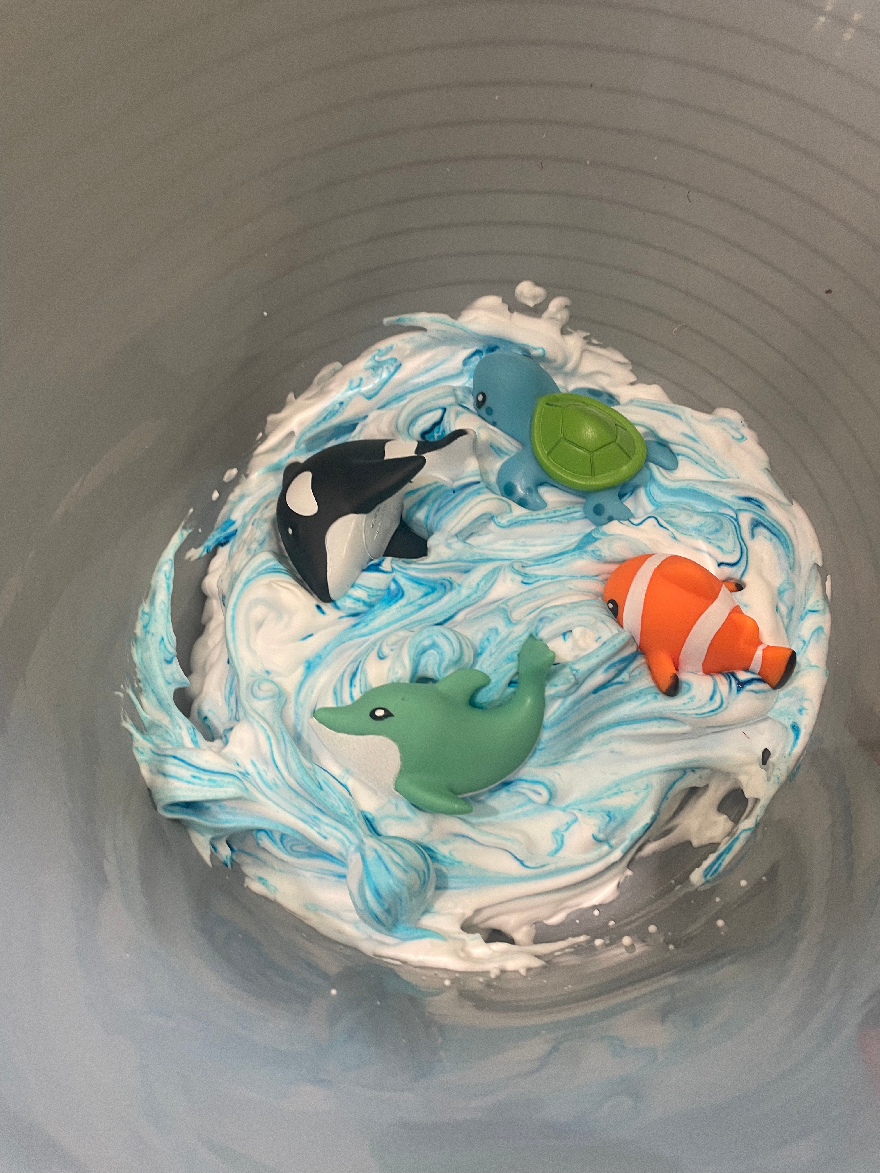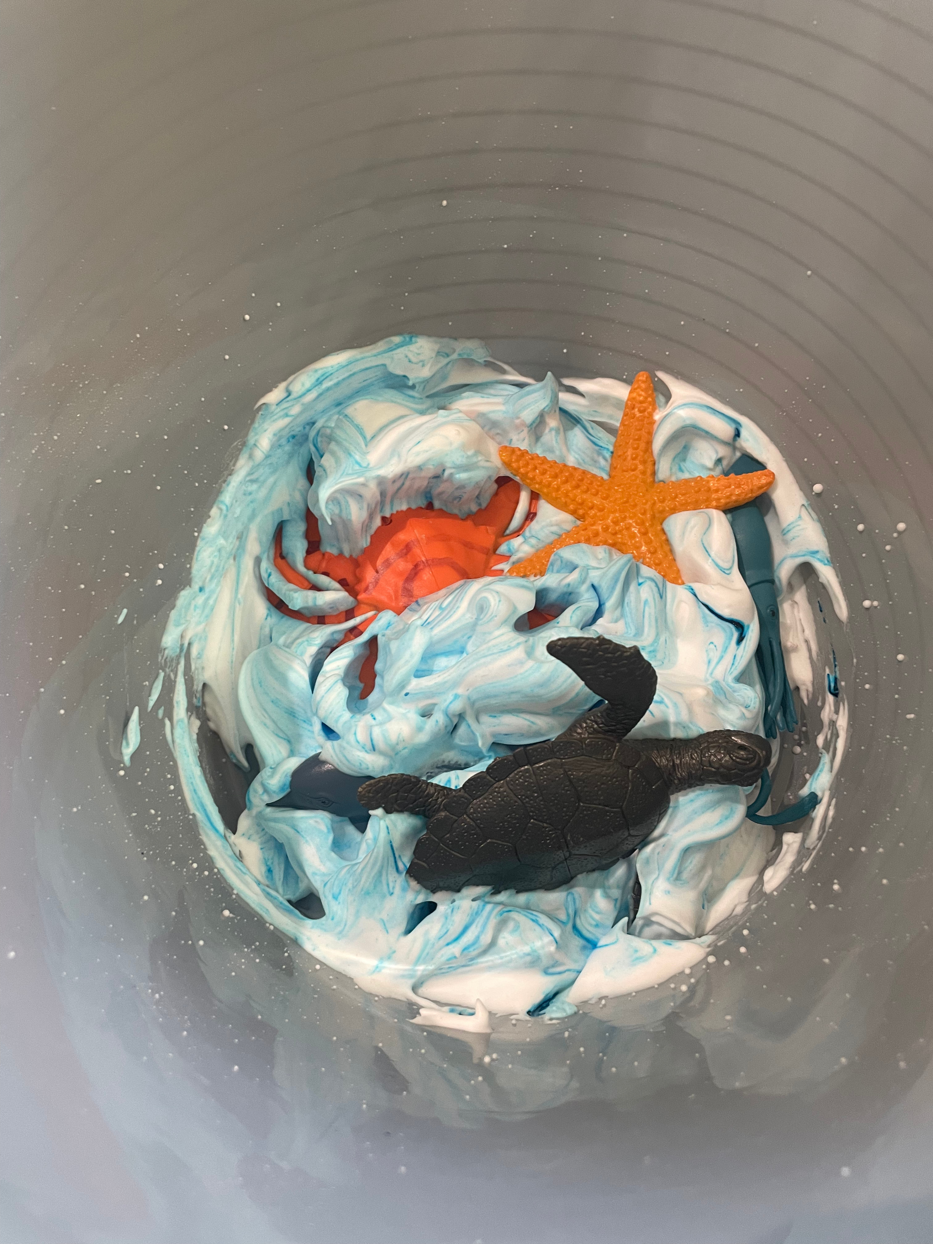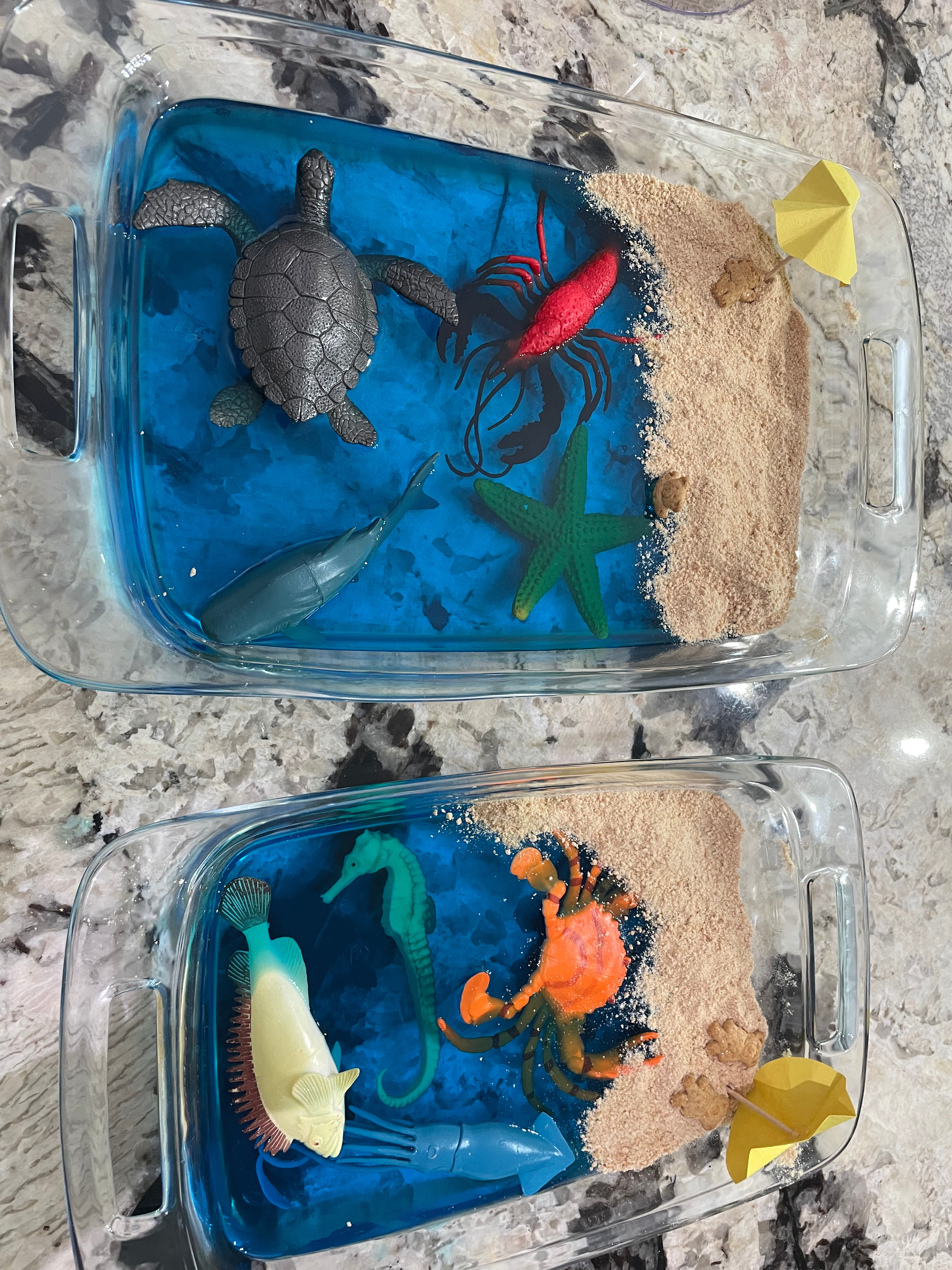 I love a good taste safe sensory activity, especially for little ones who still love to put everything in their mouth. All this requires is some boxes of blue jello, sea creatures (any figurine works), and something to cool the jello in. This one you do need to prep in advance since it does take a while for the jello to set.