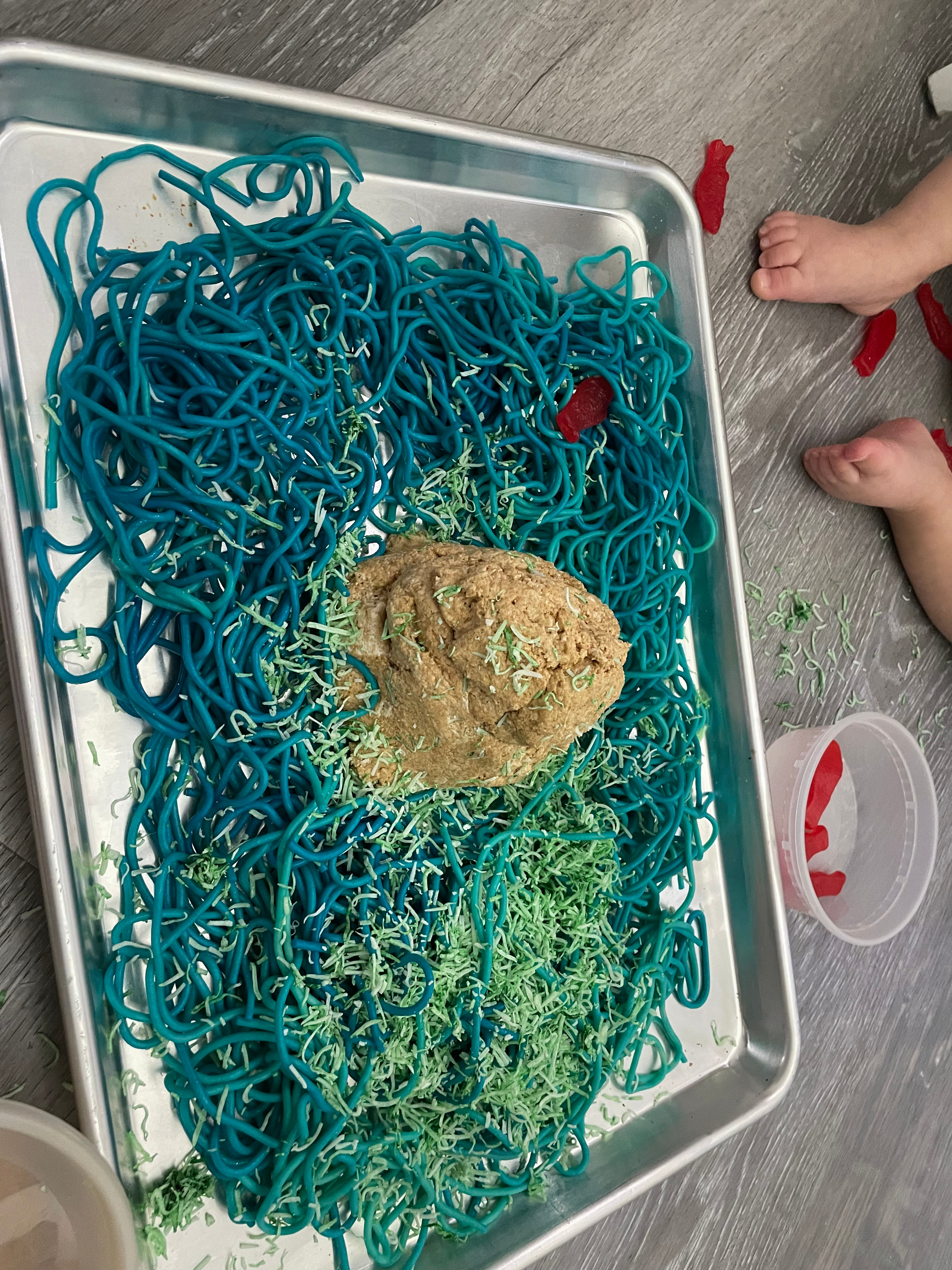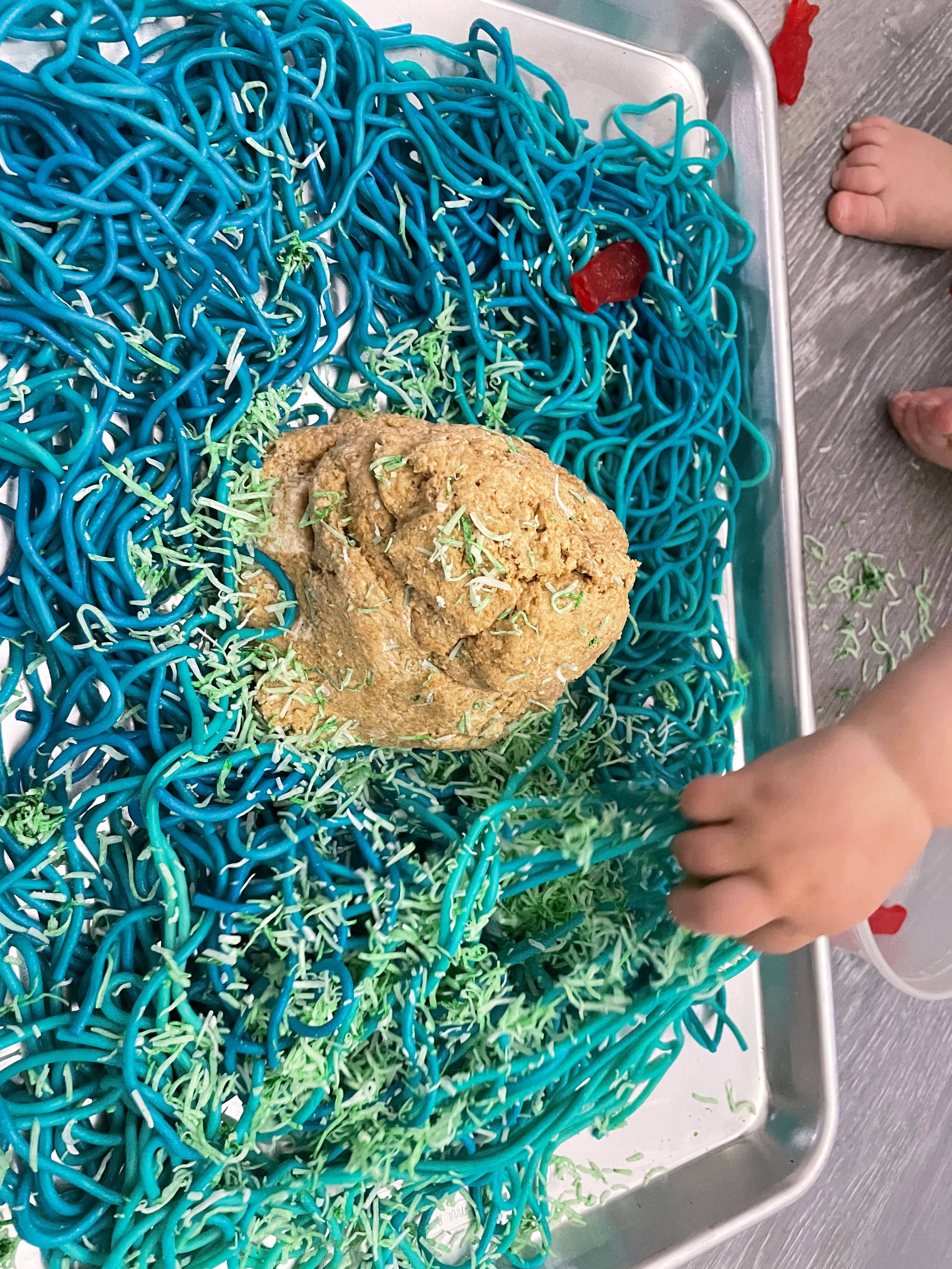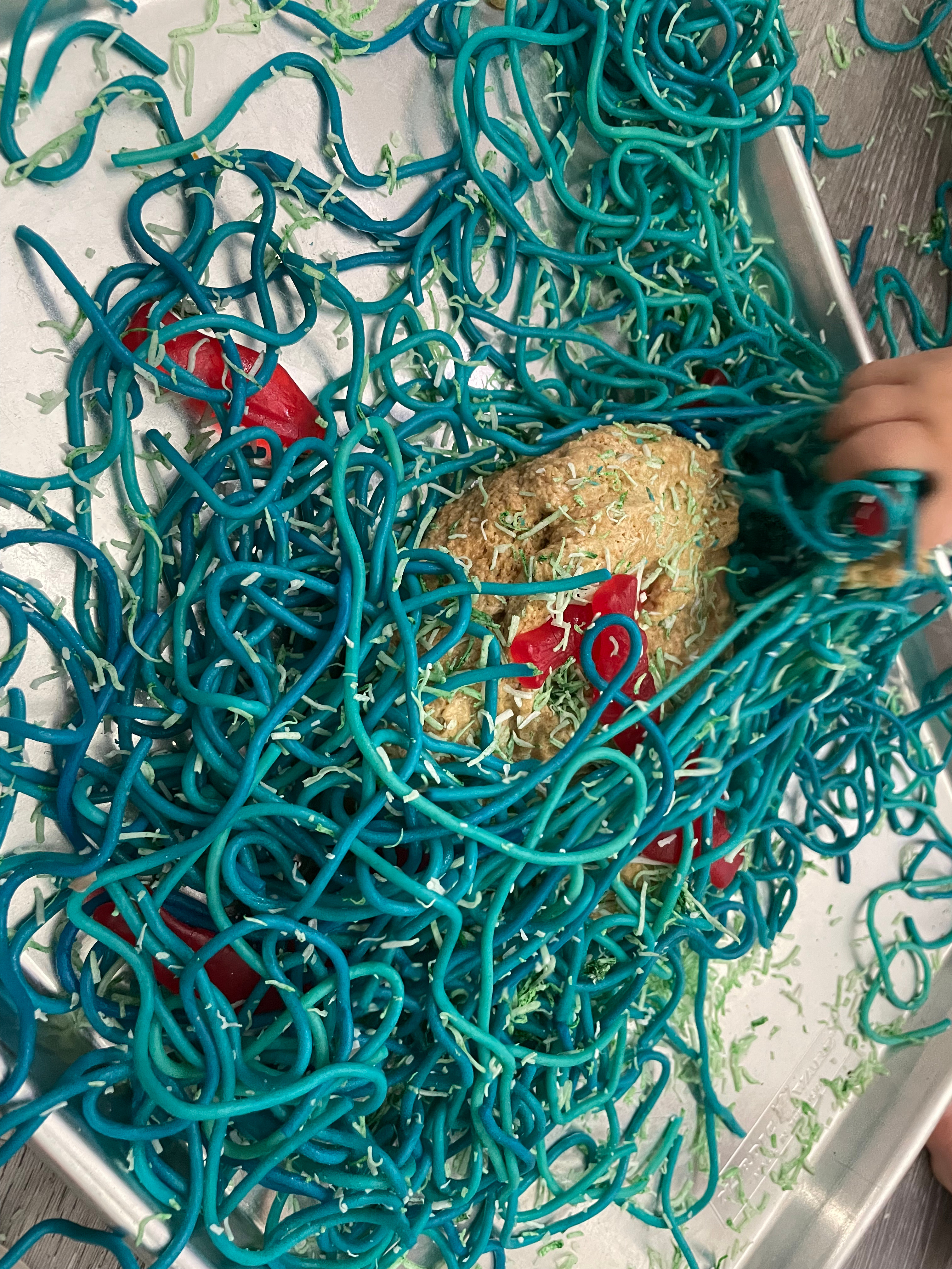 The fun part about all of this is how open-ended it is. The kids get to explore different textures, colors, and get to be tactile learners. I think my children’s favorite part was playing with the spaghetti. It was SUPER messy by the end of it, but they really did have a blast.
