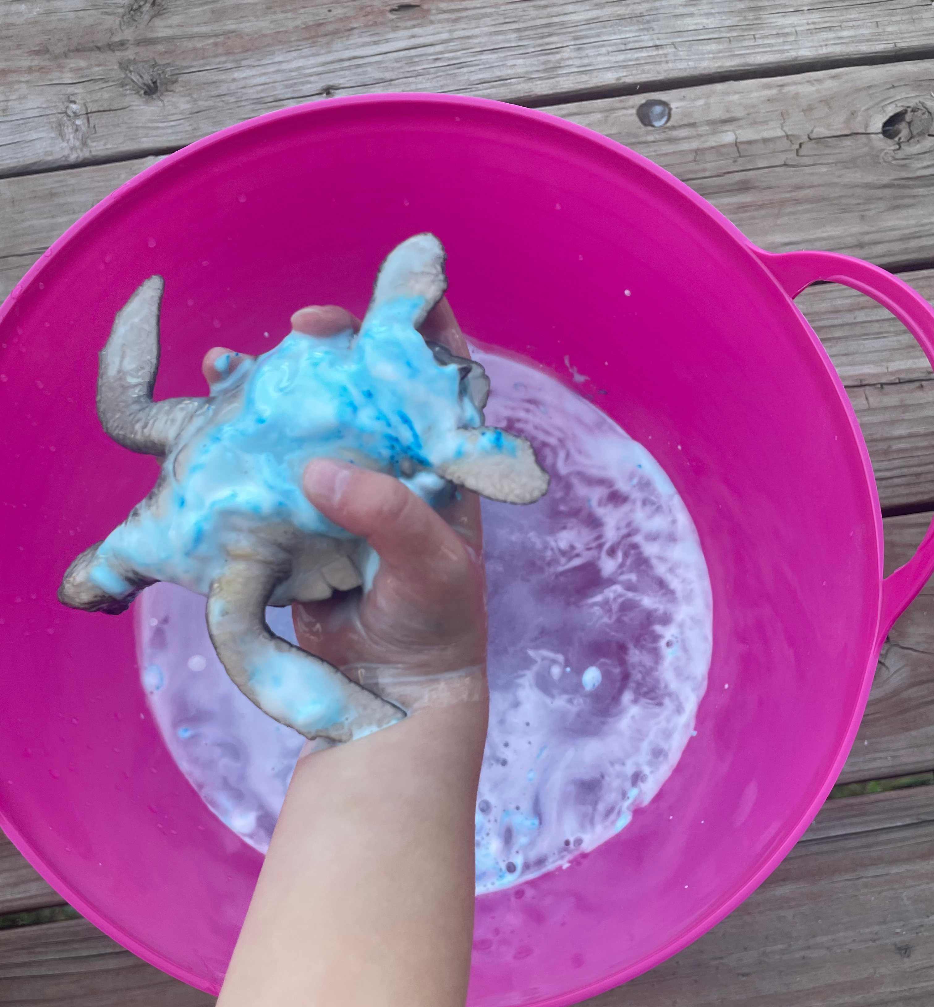 - Fill up the other bucket with water so the figurines can be cleaned. If the kids want, they can use sponges or maybe a washcloth to clean them.