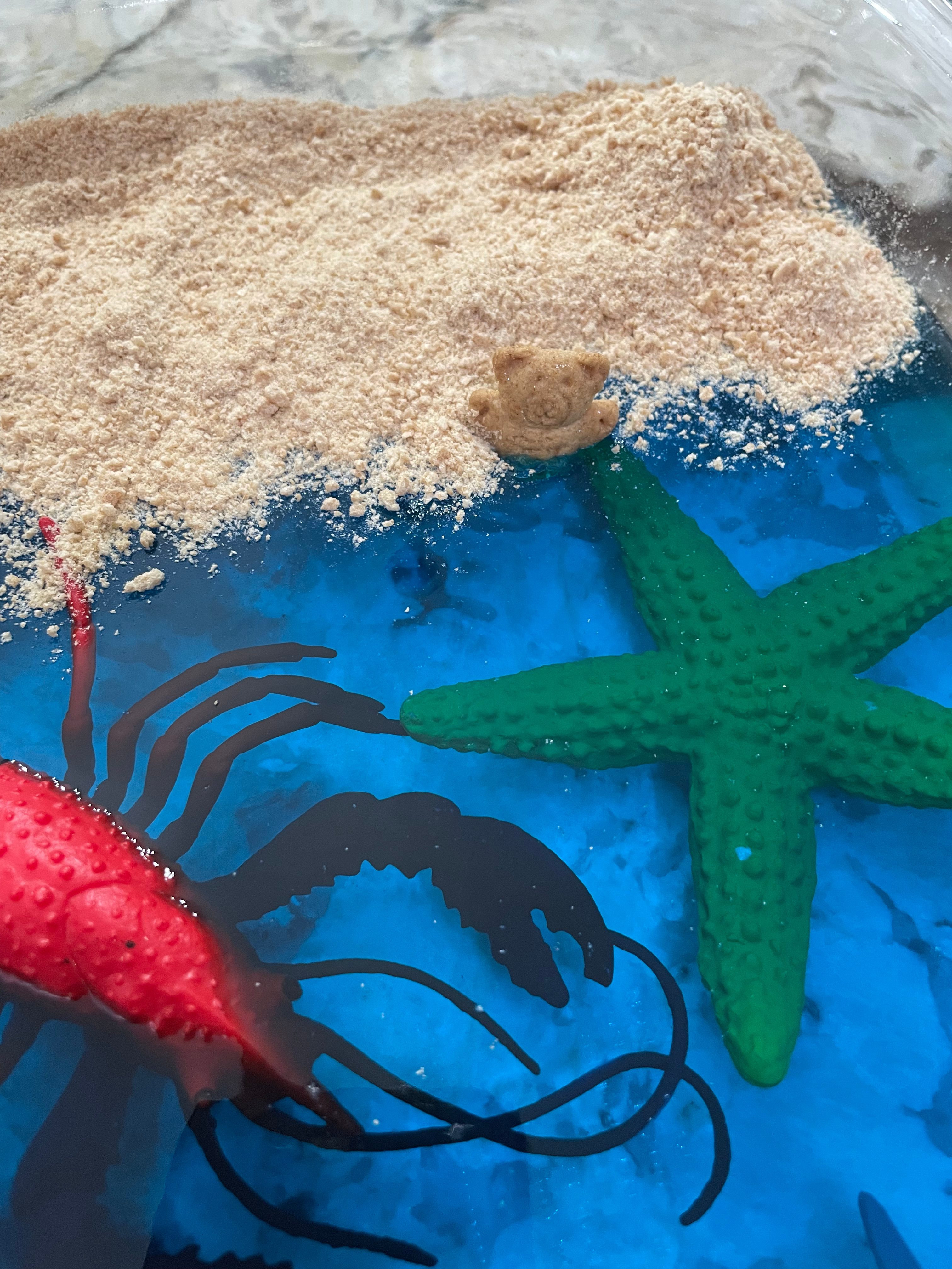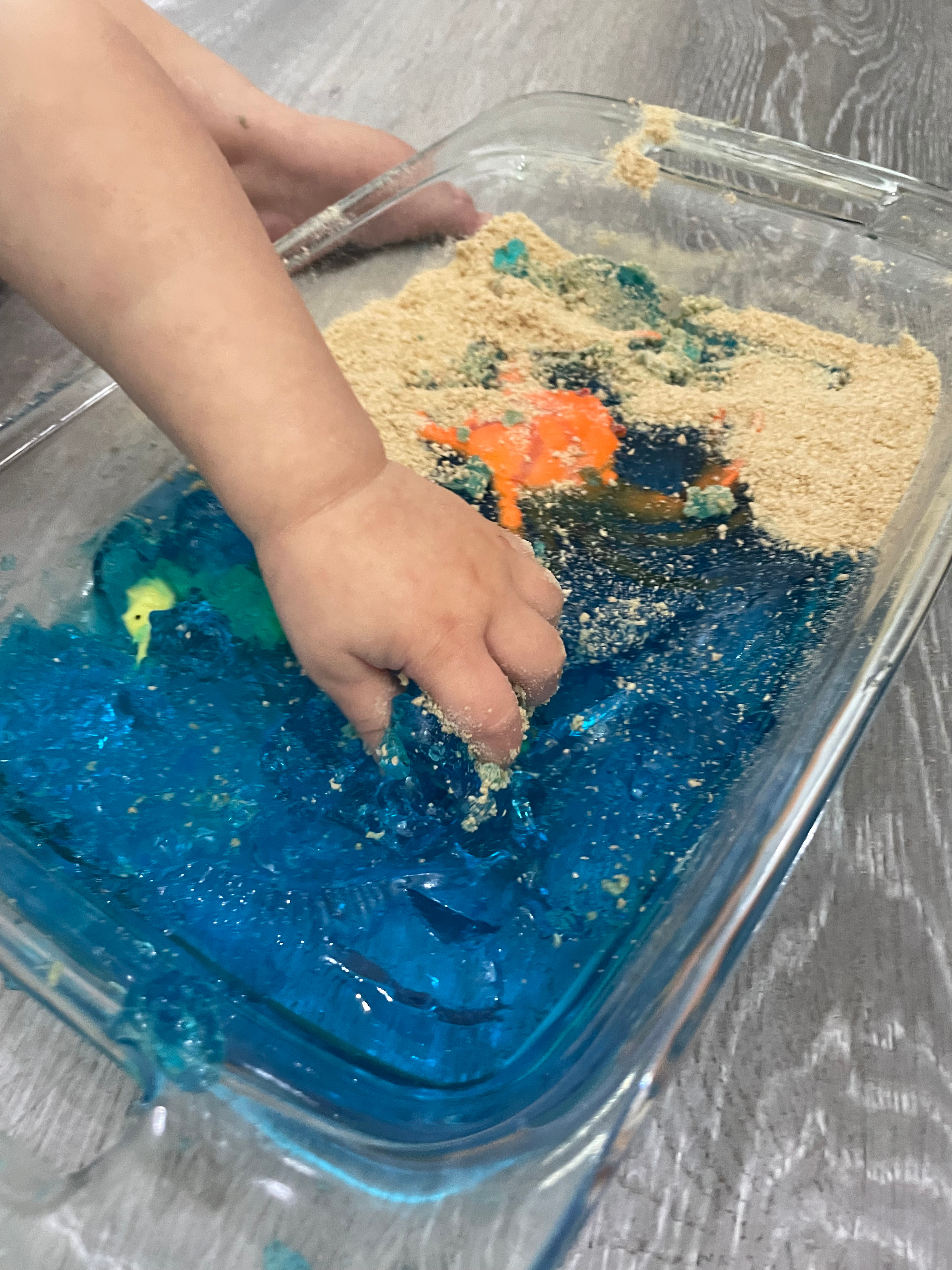 - Once it has set, you can pull it out of the fridge and have your kiddos play with it. There are some other things you can do to add to the ocean theme. You can crush some cheerios for a sandy beach, have a few Teddy Grahams as beach goers, or create mini umbrellas. This is extra, but it can provide different textures and objects to talk about with your kids in the target language. Play in the target language is so important!