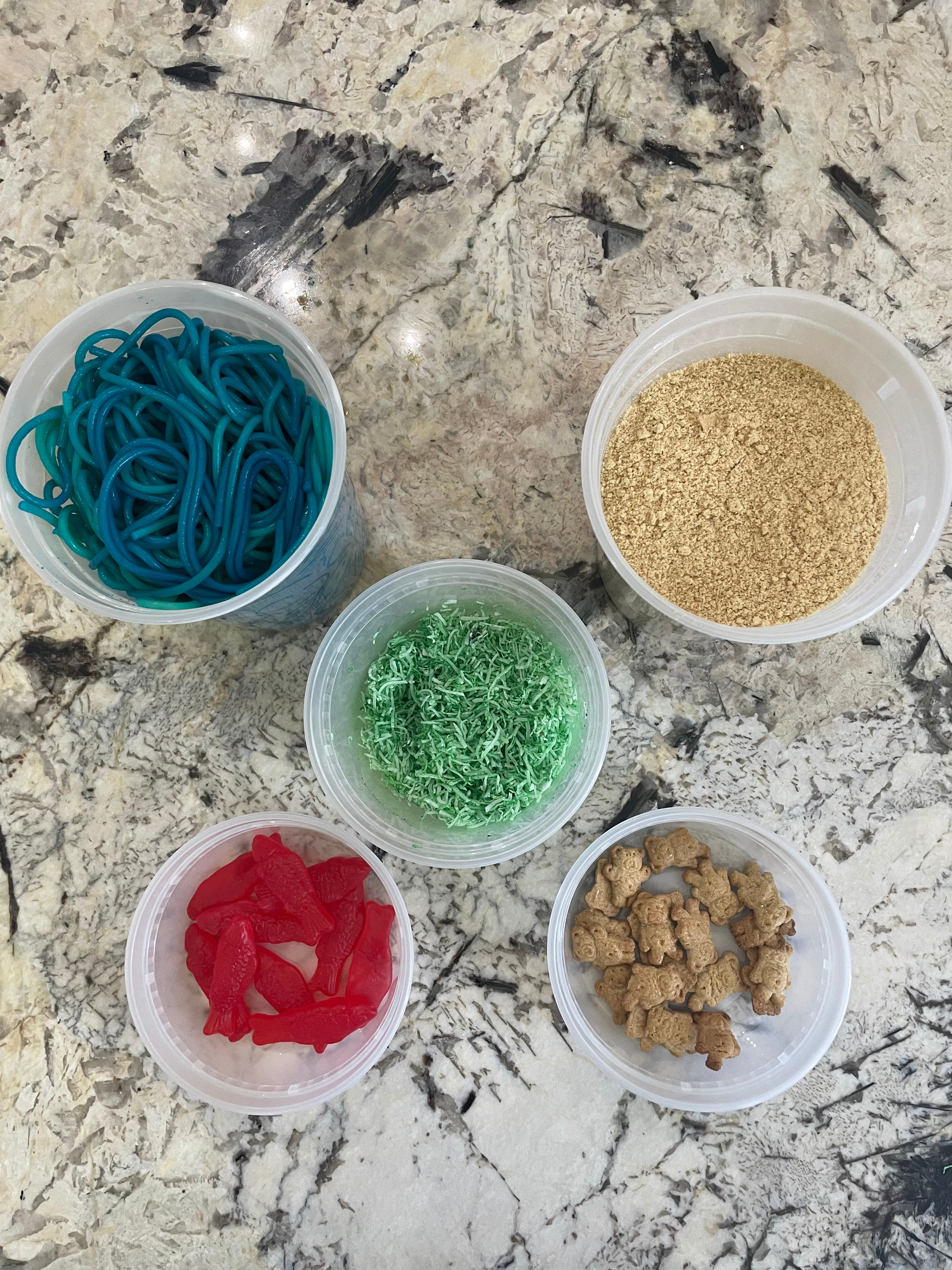 So, my idea was for my kids to make a taste-safe sand castle with a moat of spaghetti blue-dyed noodles, shredded coconut that is dyed green to be like seaweed, with Teddy Grahams and Swedish Fish.